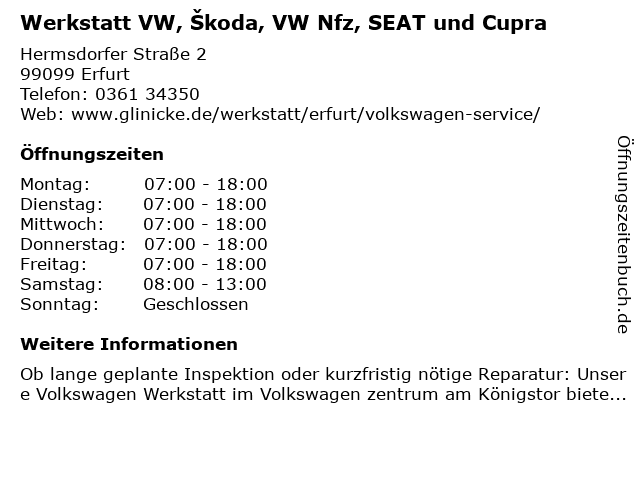 Öffnungszeiten Werkstatt VW, Škoda, VW Nfz, SEAT und Cupra