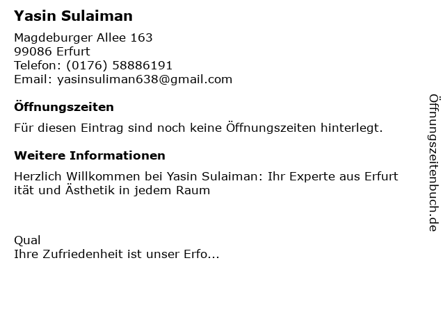 | Öffnungszeiten Yasin Sulaiman in Erfurt anzeigen | |