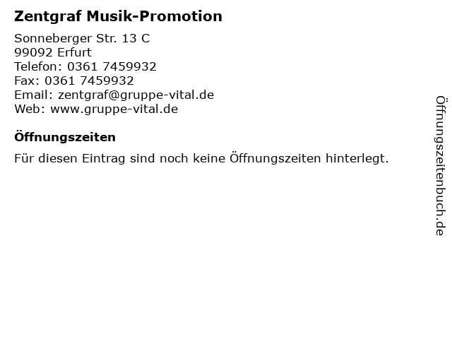 | Öffnungszeiten Zentgraf Musik-Promotion in Erfurt anzeigen | |