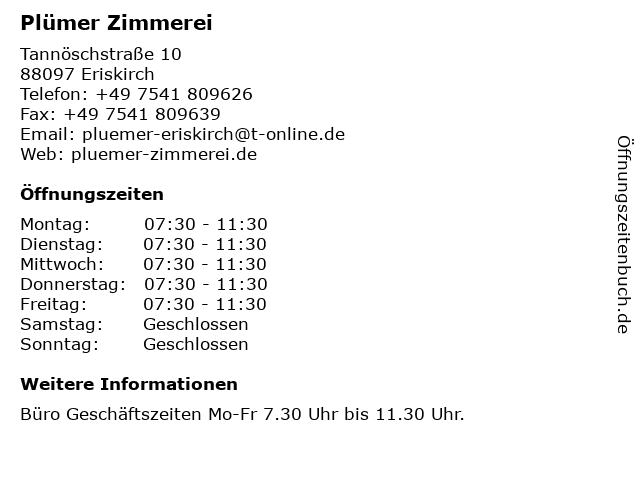 | Öffnungszeiten Plümer Zimmerei in Eriskirch anzeigen | |