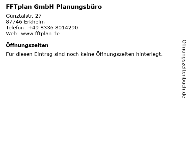 | Öffnungszeiten FFTplan GmbH Planungsbüro in Erkheim anzeigen | |