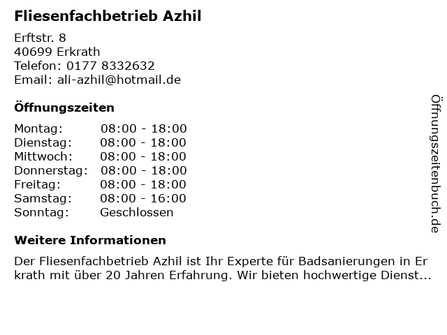 | Öffnungszeiten Fliesenfachbetrieb Azhil in Erkrath anzeigen | |