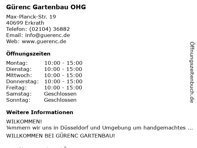 | Öffnungszeiten Gürenc Gartenbau OHG in Erkrath anzeigen | |
