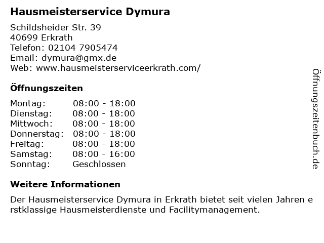 | Öffnungszeiten Hausmeisterservice Dymura in Erkrath anzeigen | |