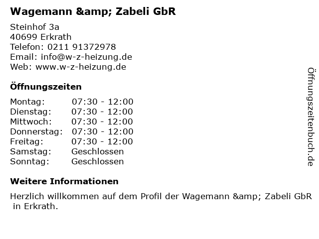 | Öffnungszeiten Wagemann & Zabeli GbR in Erkrath anzeigen | |