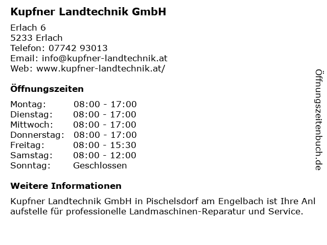 | Öffnungszeiten Kupfner Landtechnik GmbH in Erlach anzeigen | |