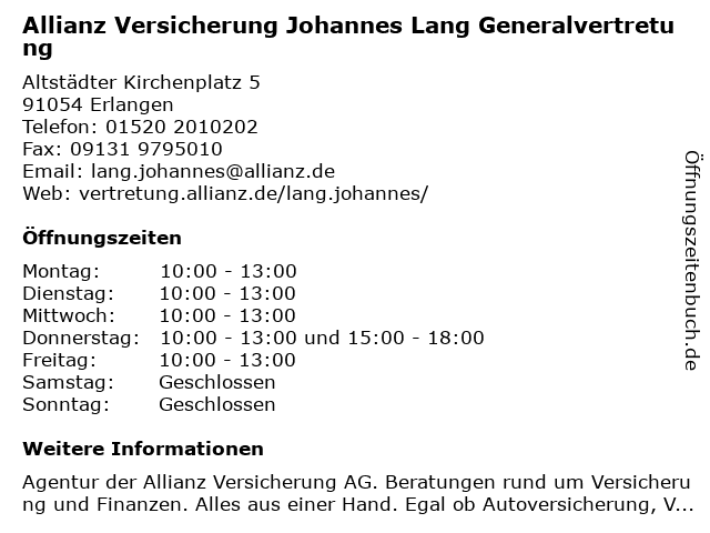 3 6 Allianz Versicherung Scheer und Bleisch e.K. Inh. Marcus Rübner Generalvertretung (Entfernung: 1,68 km) Steinforststraße 2, 91056 Erlangen |