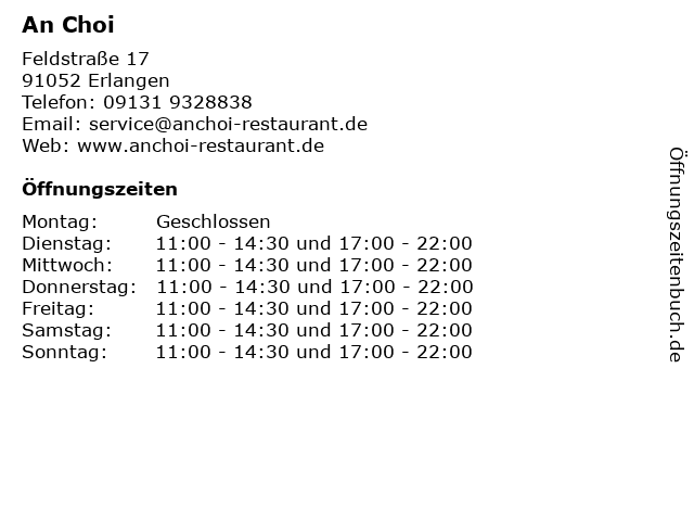 | Öffnungszeiten An Choi in Erlangen anzeigen | |