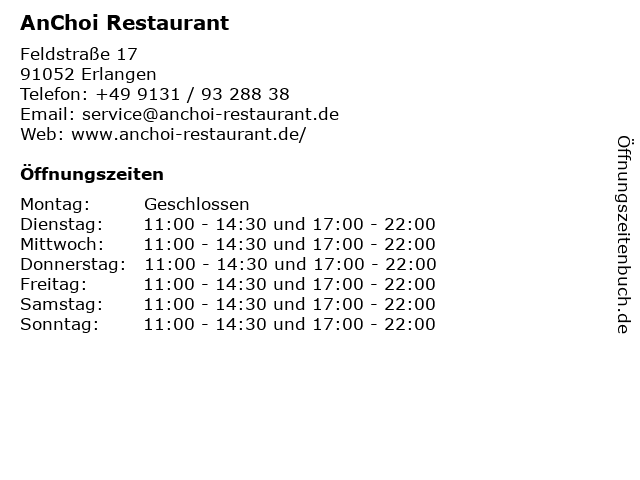 | Öffnungszeiten AnChoi Restaurant in Erlangen anzeigen | |