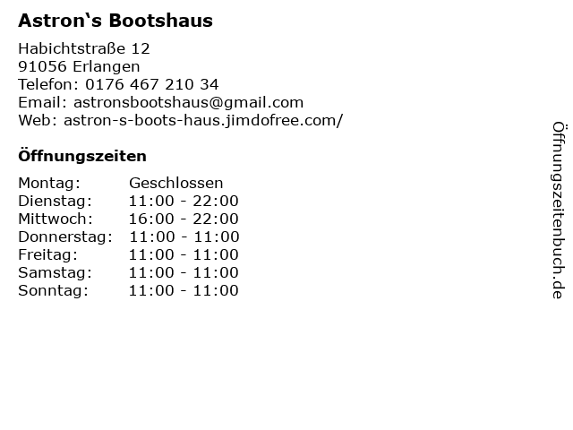 | Öffnungszeiten Astron‘s Bootshaus in Erlangen anzeigen | |