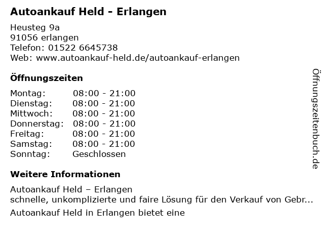 | Öffnungszeiten Autoankauf Held - Erlangen in erlangen anzeigen | |