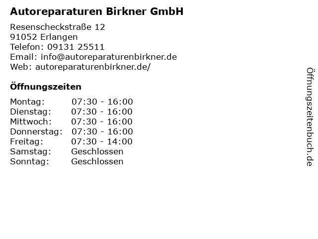 | Öffnungszeiten Autoreparaturen Birkner GmbH in Erlangen anzeigen | |