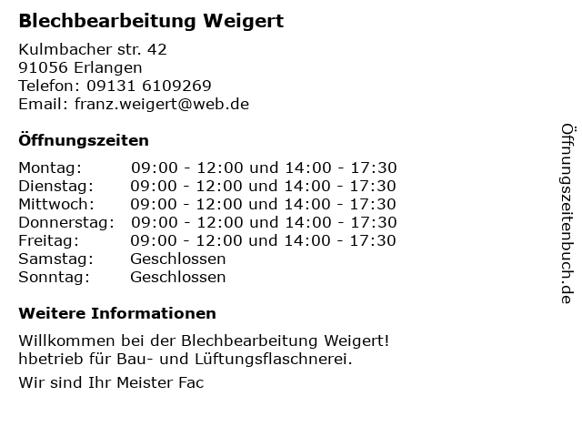 | Öffnungszeiten Blechbearbeitung Weigert in Erlangen anzeigen | |