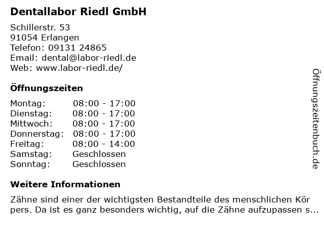 | Öffnungszeiten Dentallabor Riedl GmbH in Erlangen anzeigen | |