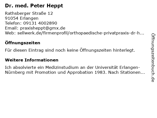 | Öffnungszeiten Dr. med. Peter Heppt in Erlangen anzeigen | |