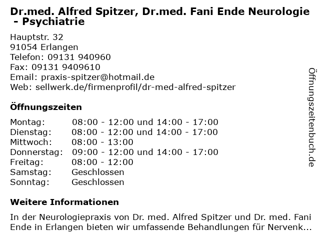 Branchen & Suchbegriffe zu Dr.med. Alfred Spitzer, Dr.med. Fani Ende Neurologie - Psychiatrie:alfred, dr.med., ende, fani, neurologie, psychiatrie, spitzer |