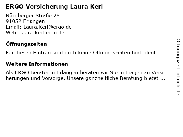 | Öffnungszeiten ERGO Versicherung Laura Kerl in Erlangen anzeigen | |