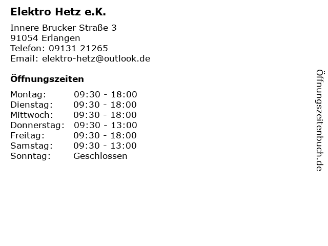 | Öffnungszeiten Elektro Hetz e.K. in Erlangen anzeigen | |
