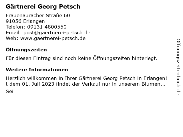 | Öffnungszeiten Gärtnerei Georg Petsch in Erlangen anzeigen | |