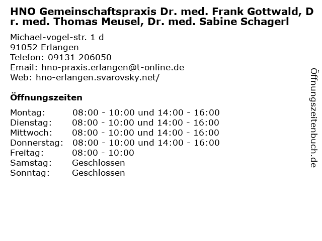 HNO Gemeinschaftspraxis Dr. med. Frank Gottwald, Dr. med. Thomas Meusel, Dr. med. Sabine Schagerl in Erlangen: Telefonnummer, Öffnungszeiten und Adresse Aktualisiert am: 02.10.2025
