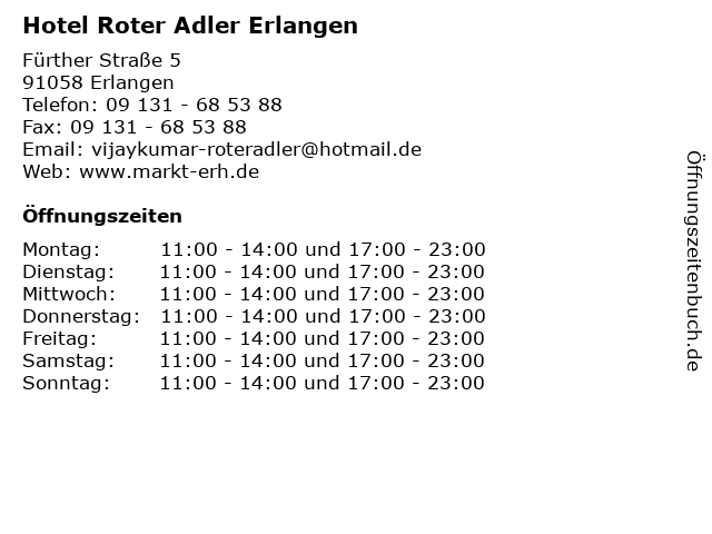 | Öffnungszeiten Hotel Roter Adler Erlangen in Erlangen anzeigen | |