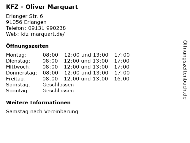 | Öffnungszeiten KFZ - Oliver Marquart in Erlangen anzeigen | |