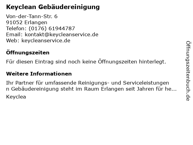 | Öffnungszeiten Keyclean Gebäudereinigung in Erlangen anzeigen | |
