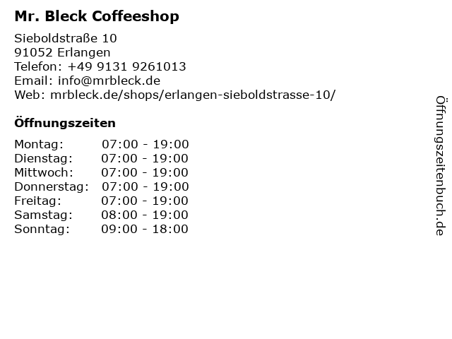 | Öffnungszeiten Mr. Bleck Coffeeshop in Erlangen anzeigen | |
