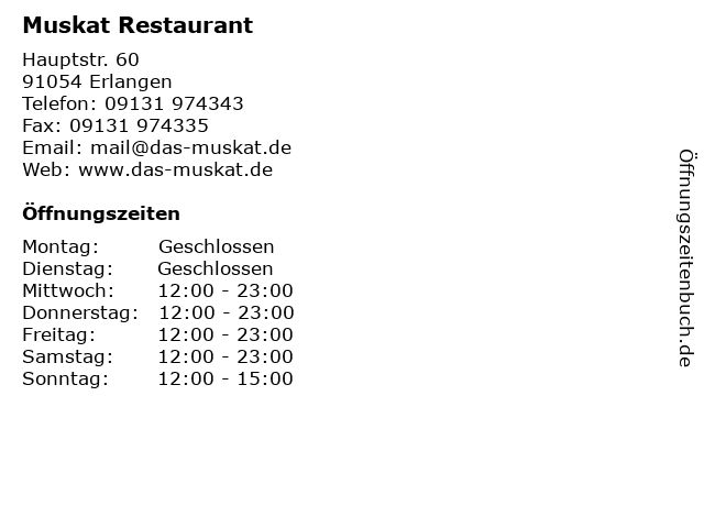 | Öffnungszeiten Muskat Restaurant in Erlangen anzeigen | |
