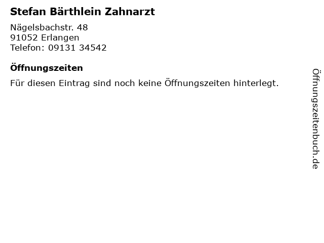 | Öffnungszeiten Stefan Bärthlein Zahnarzt in Erlangen anzeigen | |