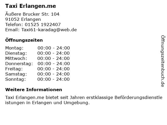 Öffnungszeiten Taxi Erlangen.me in Erlangen anzeigen | |