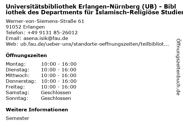 Branchen & Suchbegriffe zu Universitätsbibliothek Erlangen-Nürnberg (UB) - Bibliothek des Departments für Islamisch-Religiöse Studien:bibliothek, buch, buchscanner, departments, des, islamisch, literaturen, religiöse, sprachen, studien, ub, universitätsbibliothek |