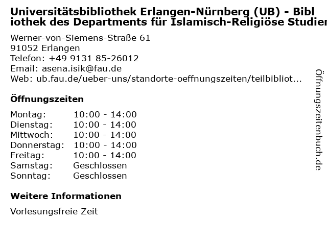 Branchen & Suchbegriffe zu Universitätsbibliothek Erlangen-Nürnberg (UB) - Bibliothek des Departments für Islamisch-Religiöse Studien:bibliothek, buch, buchscanner, departments, des, islamisch, literaturen, religiöse, sprachen, studien, ub, universitätsbibliothek |