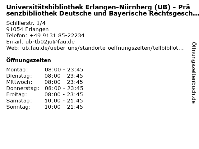 Branchen & Suchbegriffe zu Universitätsbibliothek Erlangen-Nürnberg (UB) - Präsenzbibliothek Deutsche und Bayerische Rechtsgeschichte und Bürgerliches Recht:bayerische, bibliothek, buch, buchscanner, bürgerliches, deutsche, literaturen, präsenzbibliothek, recht, rechtsgeschichte, sprachen, ub, universitätsbibliothek |