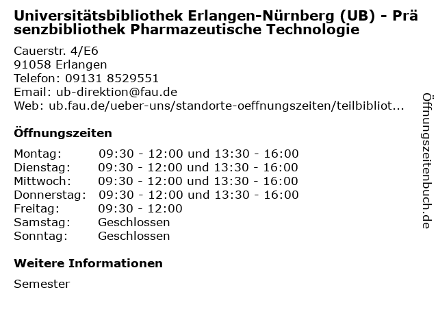 Branchen & Suchbegriffe zu Universitätsbibliothek Erlangen-Nürnberg (UB) - Präsenzbibliothek Pharmazeutische Technologie:chemie, pharmazeutische, pharmazie, präsenzbibliothek, semester, technologie, teilbibliothek, teilbibliotheken, ub, unibib erlangen-nürnberg, universitätsbibliothek, universitätsbibliothek erlangen |