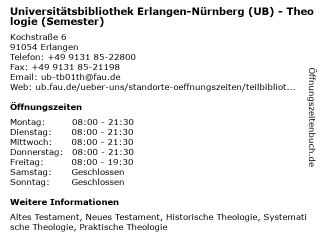 Branchen & Suchbegriffe zu Universitätsbibliothek Erlangen-Nürnberg (UB) - Theologie (Semester):bibliothek, buch, buchscanner, literaturen, semester, sprachen, theologie, ub, universitätsbibliothek |