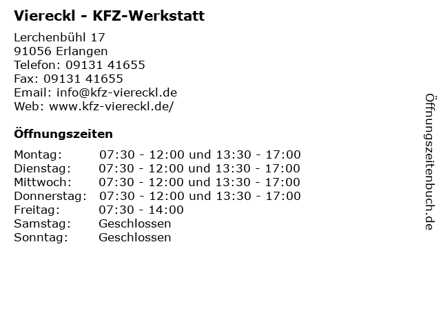 | Öffnungszeiten Viereckl - KFZ-Werkstatt in Erlangen anzeigen | |