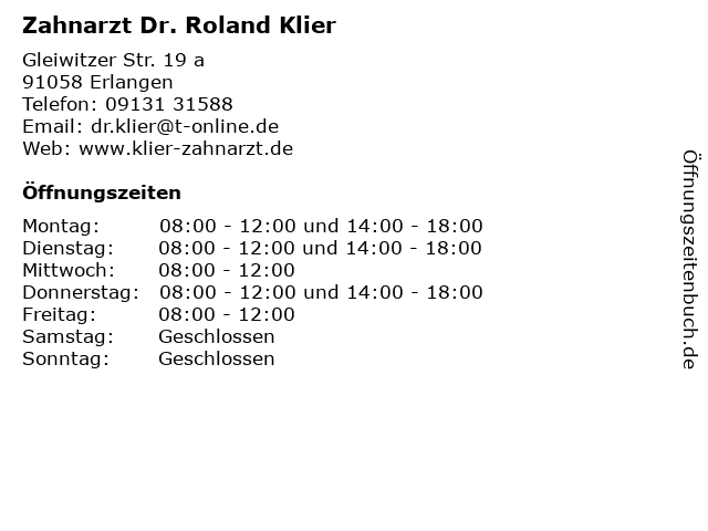 | Öffnungszeiten Zahnarzt Dr. Roland Klier in Erlangen anzeigen | |