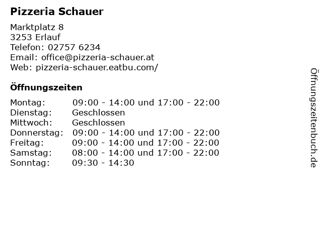 | Öffnungszeiten Pizzeria Schauer in Erlauf anzeigen | |
