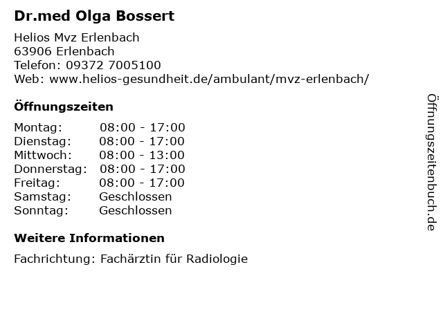 | Öffnungszeiten Dr.med Olga Bossert in Erlenbach anzeigen | |