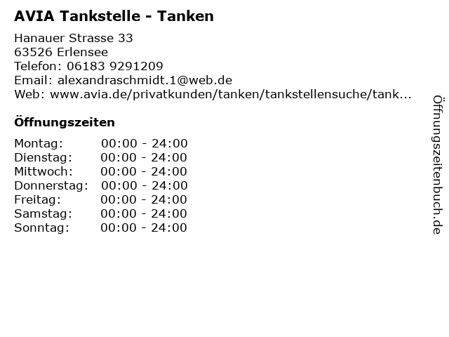 | Öffnungszeiten AVIA Tankstelle - Tanken in Erlensee anzeigen | |