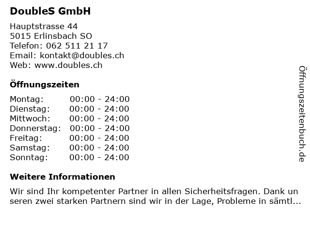 | Öffnungszeiten DoubleS GmbH in Erlinsbach SO anzeigen | |