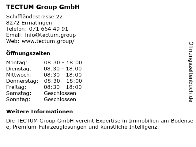 | Öffnungszeiten TECTUM Group GmbH in Ermatingen anzeigen | |