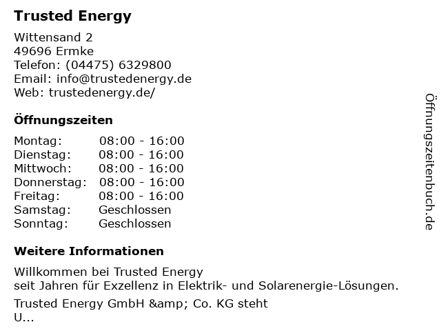 | Öffnungszeiten Trusted Energy in Ermke anzeigen | |