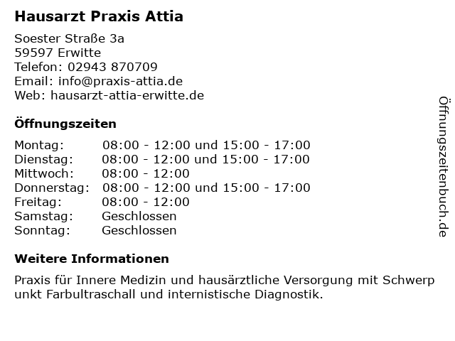 | Öffnungszeiten Hausarzt Praxis Attia in Erwitte anzeigen | |