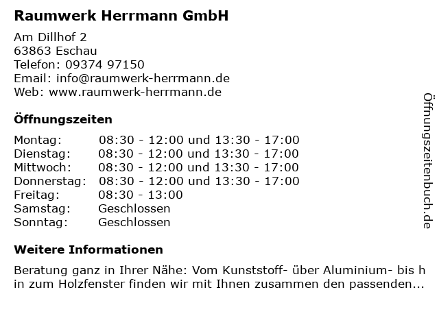 | Öffnungszeiten Raumwerk Herrmann GmbH in Eschau anzeigen | |