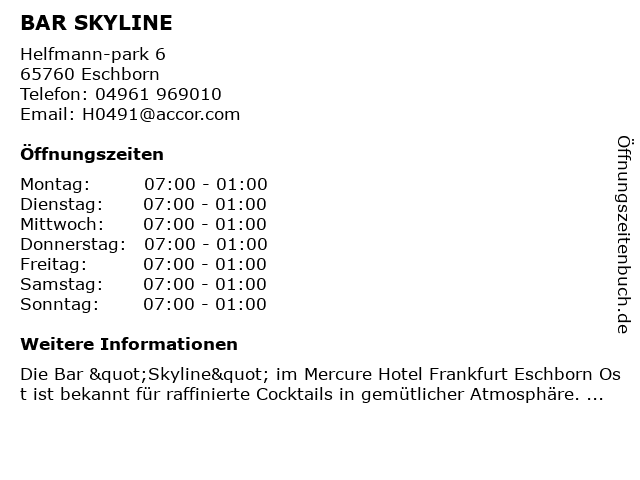 1 Mercure Hotel Frankfurt Eschborn Ost | Bar Skyline (Entfernung: 0,01 km) Helfmann-Park 6, 65760 Eschborn 5 Body Attack Premium Store Frankfurt Skyline Plaza (Entfernung: 5,92 km) Europa-Allee 6, 60327 Frankfurt am Main 6 |