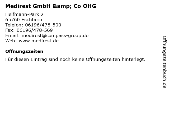 | Öffnungszeiten Medirest GmbH & Co OHG in Eschborn anzeigen | |