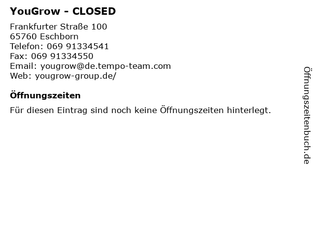 | Öffnungszeiten YouGrow - CLOSED in Eschborn anzeigen | |