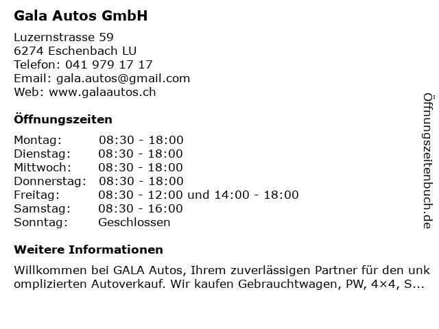 | Öffnungszeiten Gala Autos GmbH in Eschenbach LU anzeigen | |